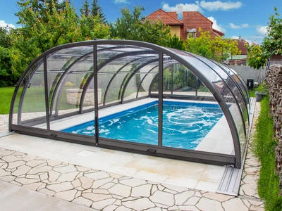 Die Poolüberdachung VIVA™ von Alukov ist eine flache Lösung mit Einzelschienen-System, das barrierefreien Zugang von drei Seiten ermöglicht. Dieses moderne Design schützt den Pool vor Schmutz, beschleunigt das Aufheizen des Wassers und hält die Temperatur über Nacht konstant.