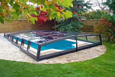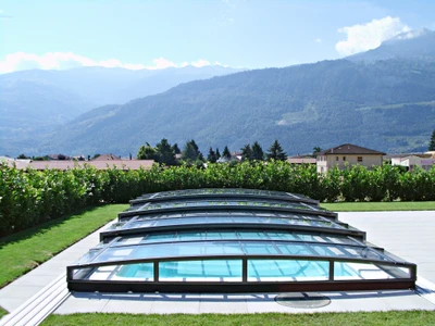 Die Poolüberdachung VIVA™ von Alukov ist eine flache Lösung mit Einzelschienen-System, das barrierefreien Zugang von drei Seiten ermöglicht. Dieses moderne Design schützt den Pool vor Schmutz, beschleunigt das Aufheizen des Wassers und hält die Temperatur über Nacht konstant.