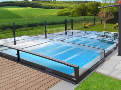 Die Überdachung TERRA™ von Alukov ist eine ultraflache Lösung, die sich nahezu mit dem Gelände verbindet. Im geschlossenen Zustand bietet sie einen ungestörten Blick auf die Poolumgebung. Das Einzelschienen-System ermöglicht barrierefreien Zugang von drei Seiten, einfache Wartung und komfortable Bedienung.
