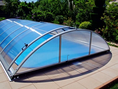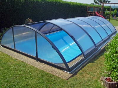 Die Poolüberdachung AZURE Flat ist eine flache Lösung mit elegantem Design, das sich dank des Mehrfachradius-Konzepts harmonisch in moderne Gärten einfügt. Sie ist mit einer Einfachsteg-Polycarbonatfüllung ausgestattet und in Silber oder Anthrazit erhältlich.
