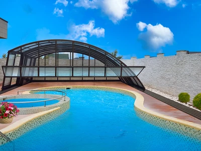 Die Poolüberdachung RAVENA™ kombiniert senkrechte Wände mit gewölbten Segmenten und ermöglicht so freien Zugang von drei Seiten. Dieses moderne Design ist ideal für Pools, die in der Nähe von Gebäuden oder Wänden liegen.