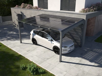 Das Carport Solar Premium ist ein hochwertiger Solarunterstand für Ihr Fahrzeug mit rahmenlosen Glas-Glas-Photovoltaikmodulen. Elegantes Design, integrierte Rinnen und Regenwasserabfluss zeichnen ihn aus. Die Single-Variante mit 9 Modulen liefert 3,91 kWp, die Double-Version mit 15 Modulen erreicht 6,52 kWp – ideal zum Laden von E-Fahrzeugen und zur Reduzierung der Energiekosten.
