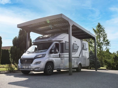 Das Carport Camper Solar ist ein multifunktionaler Unterstand für Wohnmobile, der Fahrzeugschutz mit sauberer Solarenergie verbindet. In drei Größen mit bis zu 6,96 kWp Leistung erhältlich, bietet es umweltfreundliches Parken und reduziert CO₂-Emissionen. Die anthrazitfarbene Struktur fügt sich harmonisch in moderne Architektur ein.