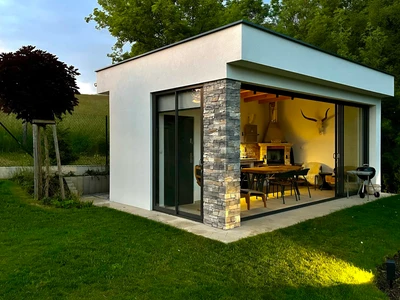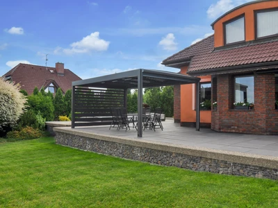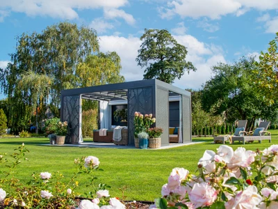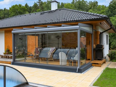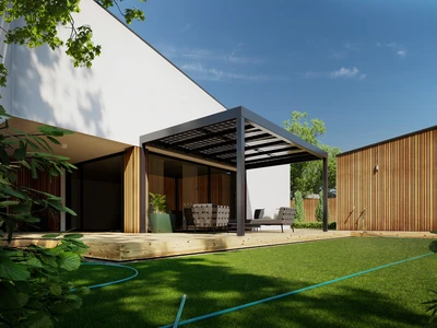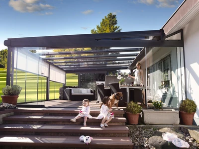 Wählen Sie aus unserem Sortiment an bioklimatischen Pergolen oder dem einzigartigen Schiebesystem für Terrassenüberdachungen CORSO. Beide Lösungen sind zertifiziert für die Montage an Holzhäusern.